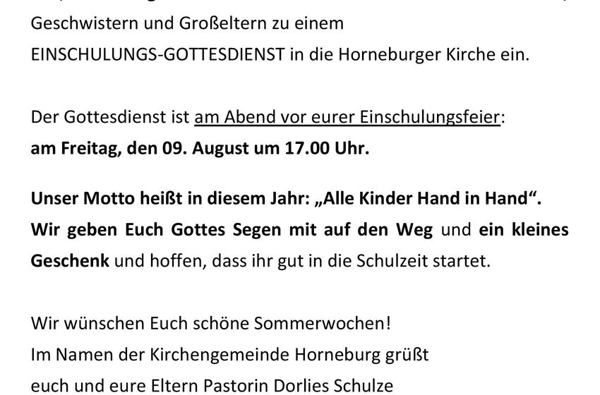 Einladung zum Einschulungsgottesdienst am 9. August 17:00 Uhr in Horneburg