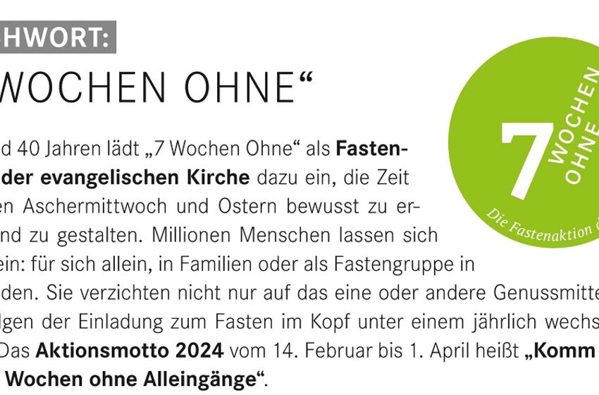 Die 7 Wochen der Passionszeit stehen in diesem Jahr unter dem Motto „Komm rüber: 7 Wochen ohne Alleingänge“. Es geht um Begegnungen, um die Pflege von Beziehungen, um die Verbundenheit mit der ...