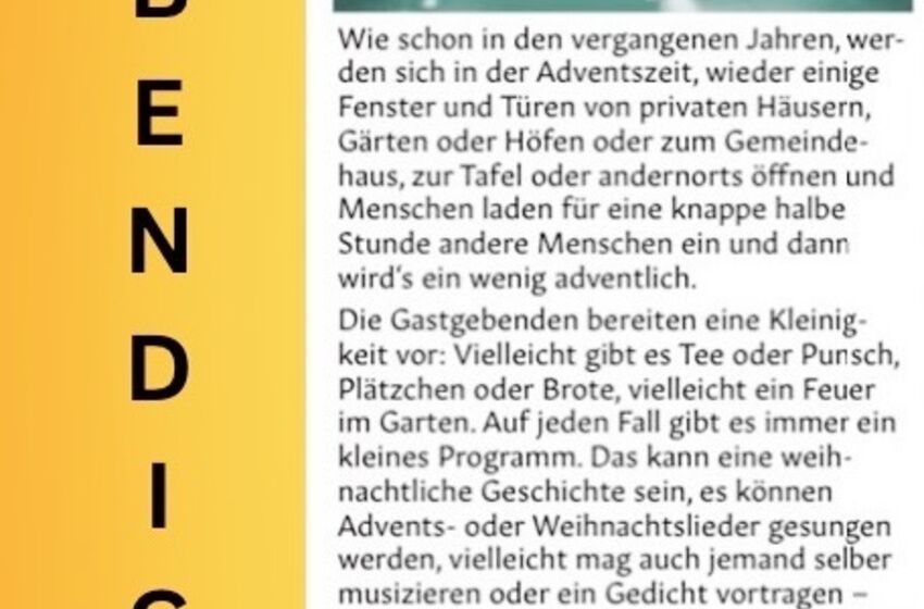 In diesem Jahr wird es wieder den lebendigen Adventskalender geben. Wir kommen zusammen, jede/r ist herzlich willkommen. An jedem Abend der Adventszeit lädt eine Familie oder Einrichtung ein. Ein ...