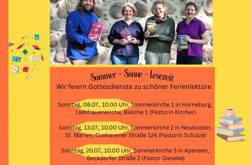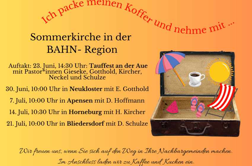 Eine herzliche Einladung zur Sommerkirche in Horneburg, Bliedersdorf, Apensen & Neukloster mit den Pastoren der BAHN-Region. Im Anschluss an den Gottesdienst laden wir jeweils herzlich zum ...