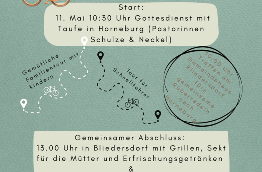 Zum Stadtradeln feiern die Kirchengemeinden Horneburg und Bliedersdorf gemeinsam einen Fahrradgottesdienst mit den Pastorinnen Mira Neckel und Dorlies Schulze. Am 11. Mai um 10:30 Uhr feiern wir ...
