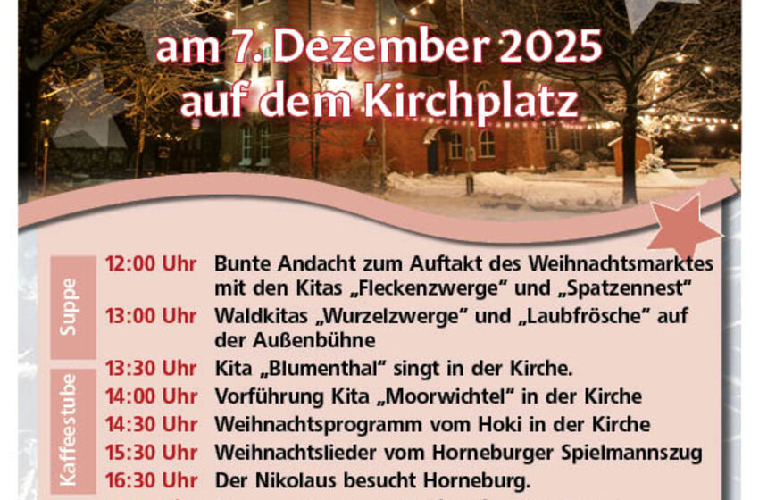 Eine herzliche Einladung zum Weihnachtsmarkt am 7. Dezember 2025 auf dem Kirchplatz in Horneburg.