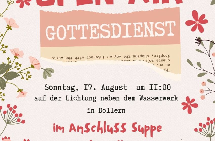 Am 17. August 2025 findet um 11 Uhr unser Open Air Gottesdienst auf der Lichtung neben dem Wasserwerk statt. Im Anschluss essen wir noch gemeinsam Suppe.