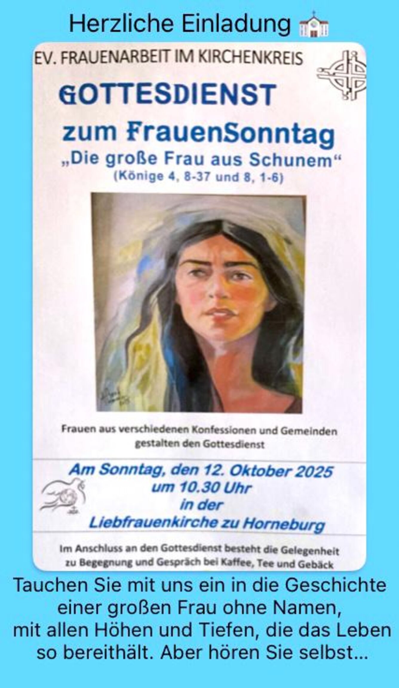 Eine herzliche Einladung zum Gottesdienst am Frauensonntag 12.10.2025 um 10:30 in die Liebfrauenkirche in Horneburg.