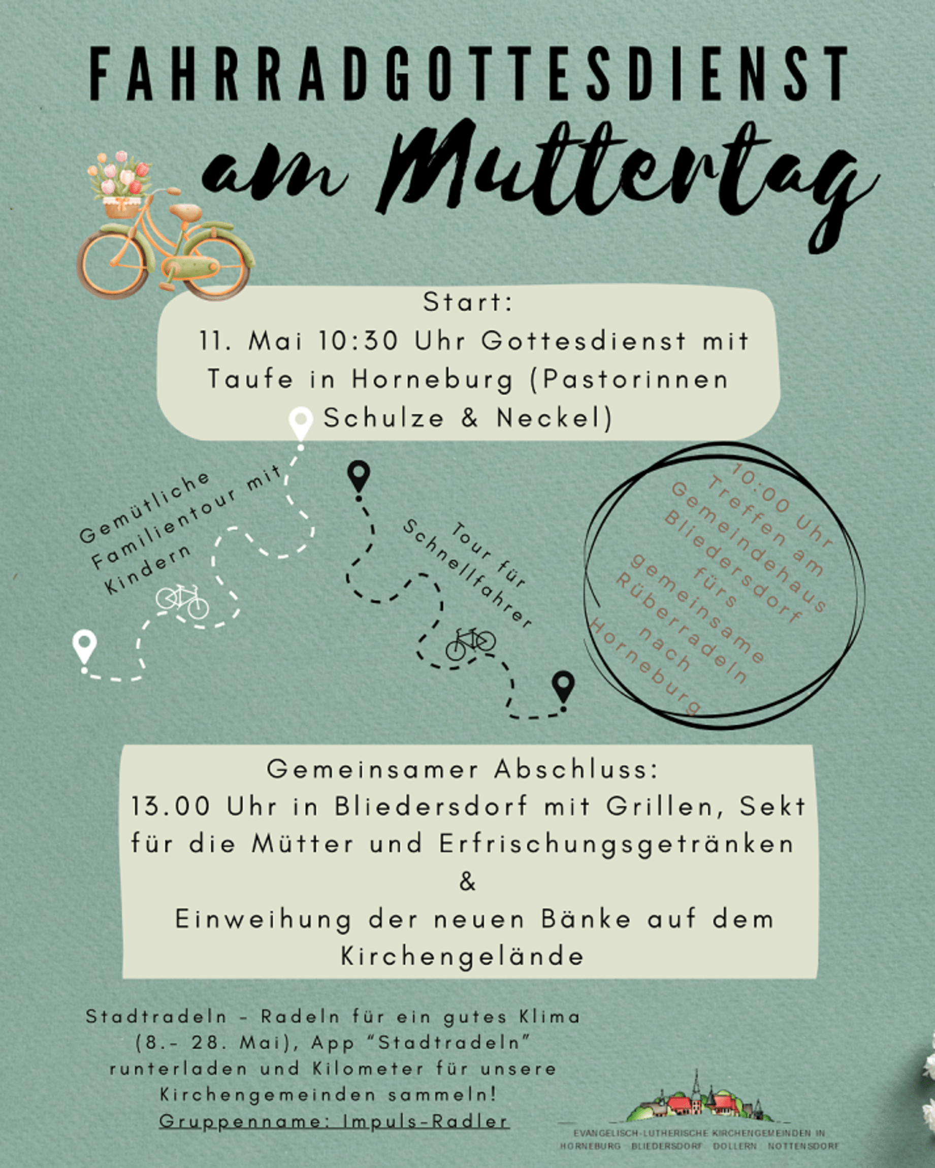 Zum Stadtradeln feiern die Kirchengemeinden Horneburg und Bliedersdorf gemeinsam einen Fahrradgottesdienst mit den Pastorinnen Mira Neckel und Dorlies Schulze. Am 11. Mai um 10:30 Uhr feiern wir in der Kirche in Horneburg einen fröhlichen Gottesdienst mit Taufen. Ab 11:45 Uhr starten dann drei geführte Radtouren zur Feldsteinkirche Bliedersdorf - eine Tour ist 10 km, eine 15 km, und eine 20 km lang. Alle drei Touren enden ca. um 13 Uhr in Bliedersdorf. Dort gibt es Essen, Trinken und nette Menschen.