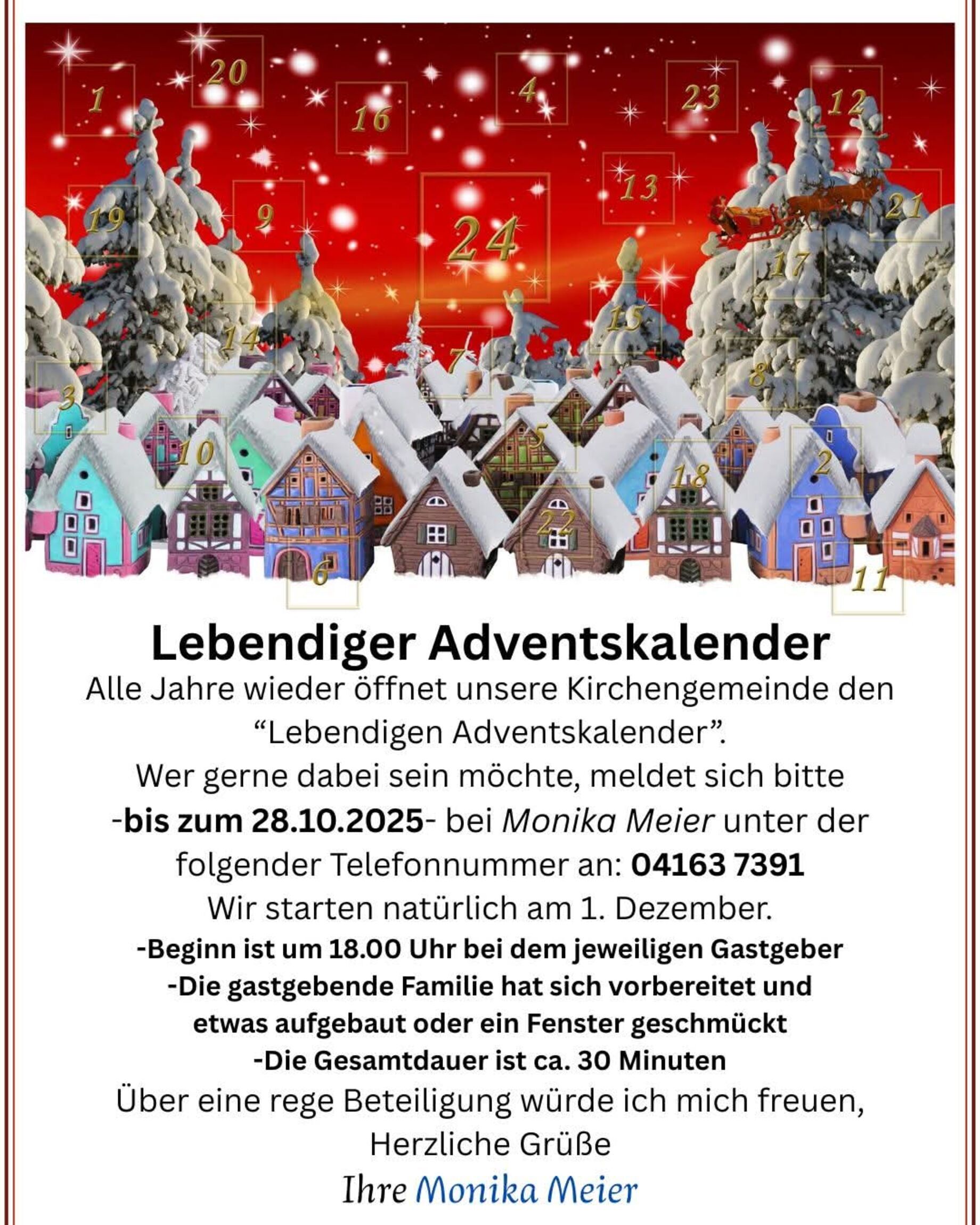 Wer gerne dabei sein möchte, meldet sich bitte – bis zum 28.10.2025 – bei Monika Meier unter der folgenden Telefonnummer an: 04163 7391