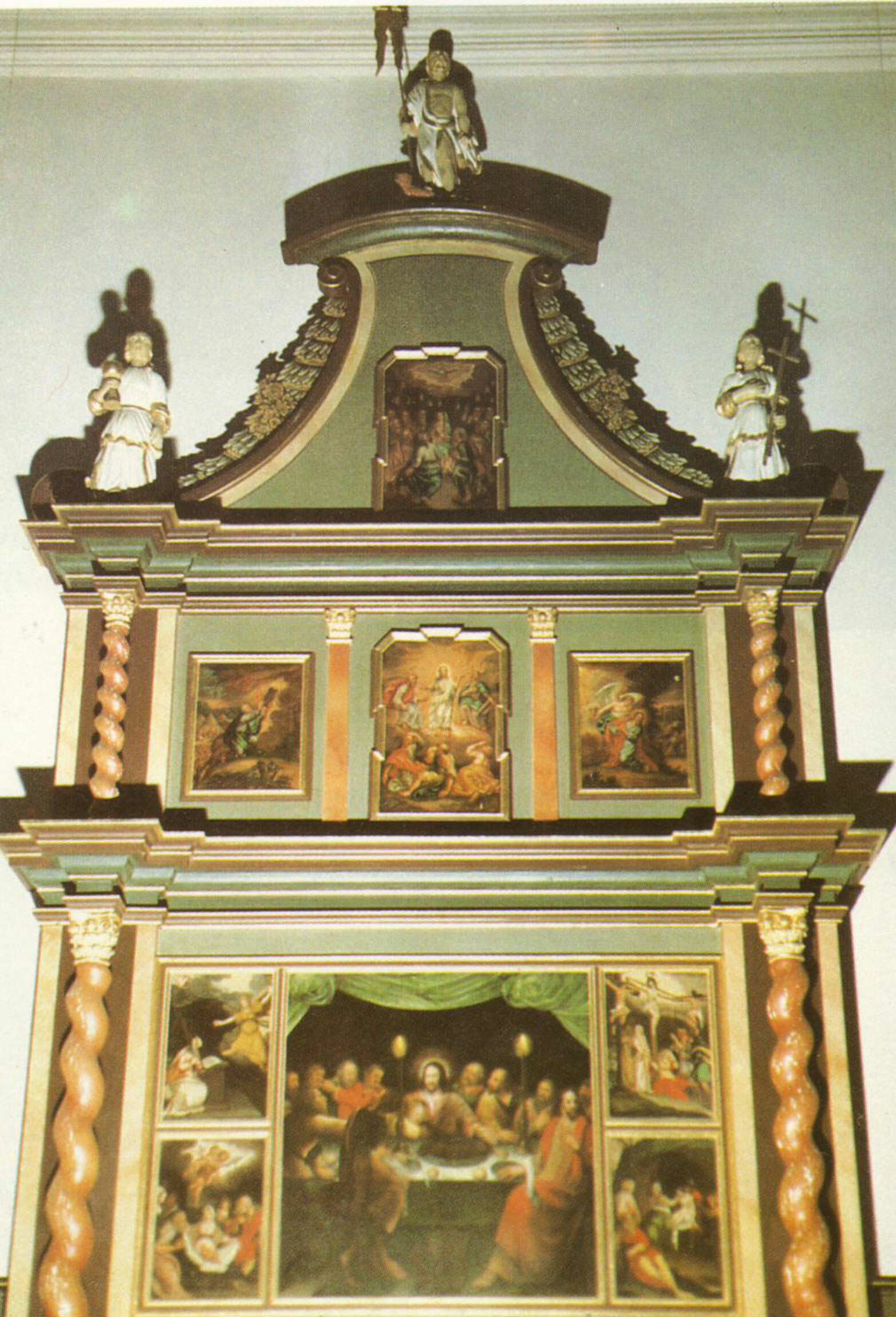 Eine Reihe von stilistischen Merkmalen, die hier nicht näher behandelt werden können, weisen deutlich darauf hin, daß das Abendmahlsbild mit den vier kleineren Bildern aus der ersten Hälfte des 17. Jahrhun-derts stammen. Vermutlich stammt es aus dem Hochaltar der Vorgängerkirche, der, laut Kirchenvisitationsbericht von 1716, 1637 von Johann von Düring gestiftet wurde.